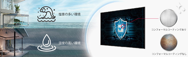 塩害、粉塵、鉄塵、湿気等の影響により、時間が経つと機能が低下する恐れがあります。主要な回路基板に コンフォーマルコーティングを施すことにより環境のリスクを大幅に削減し、テレビを保護できます。 |